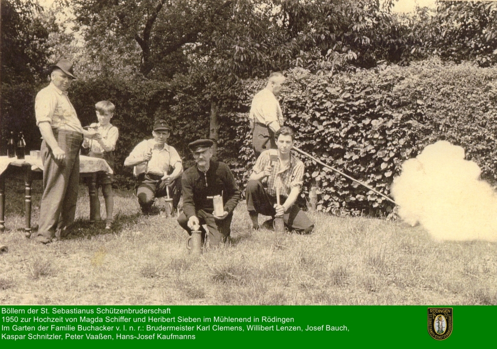Das Böllerschießen hat auch in der Schützenbruderschaft Rödingen eine Tradition. Zeitzeugen und auch Unterlagen belegen, dass anlässlich von Festen wie Pfingsten, Fronleichnam, Schützenfest, Weißen- oder Jubiläums-Hochzeiten, besonderen Geburts-, Ehren- oder Jubiläums-Tagen in Rödingen geböllert wurde. Auf dem Bild ist festgehalten, wie 1950 zur Hochzeit von Magda Schiffer und Heribert Sieben im Mühlenend in Rödingen im Garten der damaligen Familie Buchacker geböllert wird.