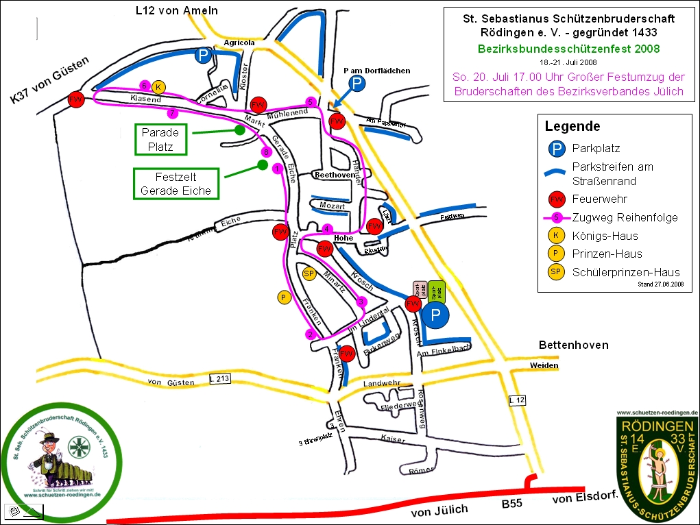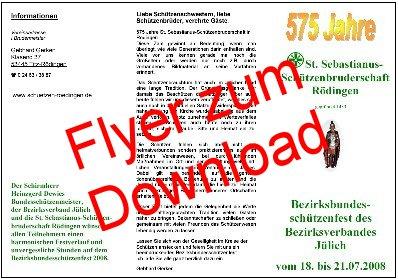 Ankündigungen zum Bezirksbundesschützenfest 2008 des Bezirksverbandes Jülich vom 18. bis 21.07.2008 in Rödingen Zum Download Flyer Bezirksbundesfest oder Programm Lage Festzelt, Schießstand: Karte Zugweg Großer Festumzug der Bruderschaften des Bezirksverbandes Jülich: Zugweg
