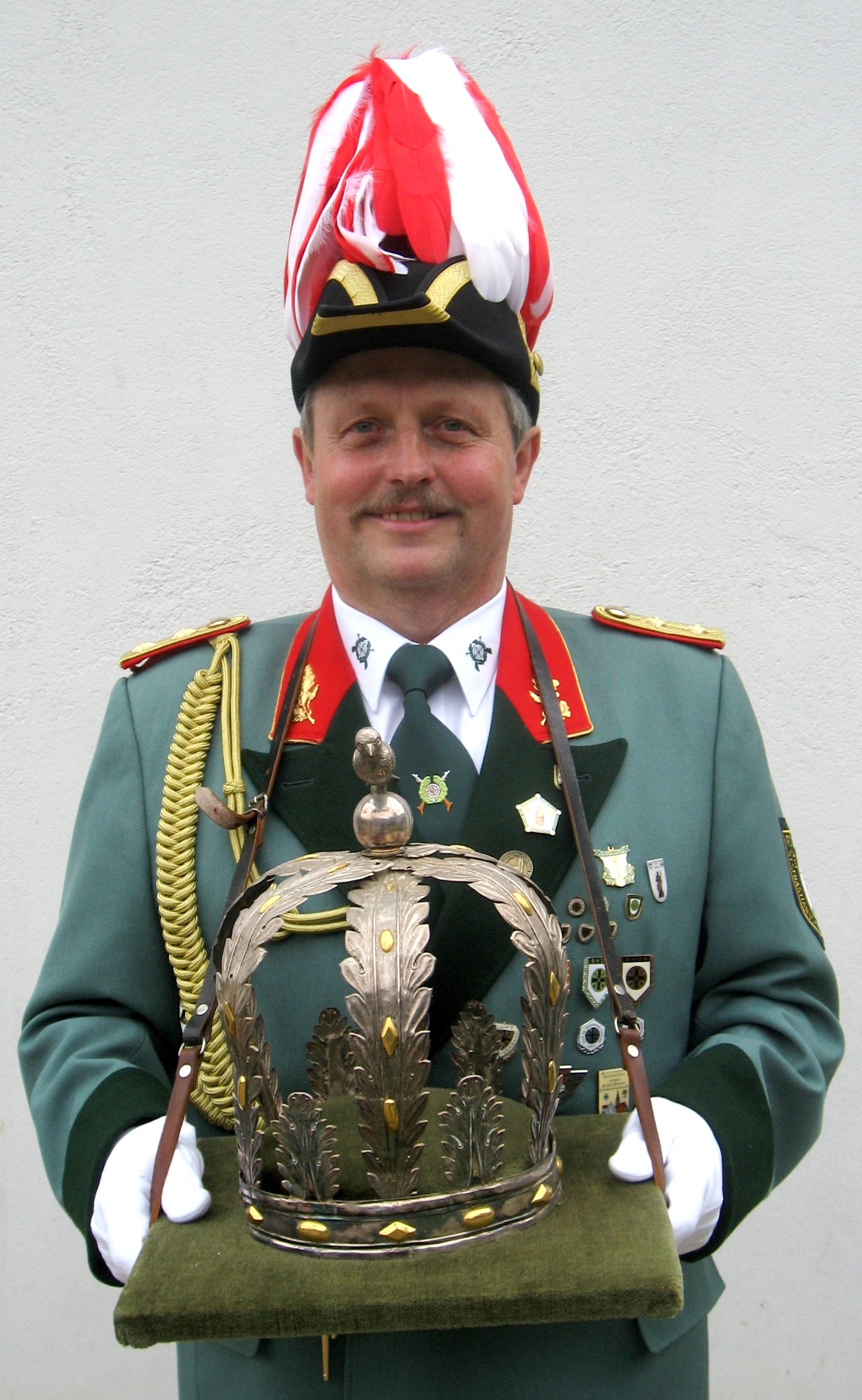 Hierfür kann nach Bekunden von Brudermeister Gebhard Gerken manch älterer Schützenbruder nicht das rechte Verständnis aufbringen. Als Prägung des Schützenwesens stellte der Bürgermeister den Bruderschaftsgedanken heraus. Während die «kriegerischen Hilfeleistungen zur Feindesabwehr abgelegt sind, spielen christliche Tugenden und der caritative Gedanke eine große Rolle im modernen Vereinsleben», betonte Nüßer. Gerken legte großen Wert auf den Erhalt «von Brauchtum und Tradition und generationsübergreifenden Beziehungen». Gleichzeitig nutzte der Brudermeister die Gelegenheit, das Rödinger Schützenfest von 18. bis 21. Juli mit dem Großen Festumzug als Höhepunkt zu bewerben, das in Verbindung mit dem Bezirksbundesschützenfest gefeiert wird. Fototafeln und Dokumente prägen die Ausstellung. Prinzen- und Schülerprinzenketten sind neben einer Königskrone aus den 50er Jahren angebracht, die heute nach dem Königsvogelschuss an Fronleichnam feierlich überreicht wird, vor einem halben Jahrhundert aber über dem Zylinder des Königs getragen wurde. Ein Handzettel aus dem Jahre 1855 listete die zwölf Statuten über den Ankauf und die Handhabung von «Böllern» oder «Katzenköpfen» auf, die an vier Stellen während der Fronleichnamsprozession abgefeuert wurden. Ein Foto aus der Zeit zeigt die Vorbereitung der «Böller». (Quelle: Aachener Zeitung Ausgabe 11.06.2008; ptj)