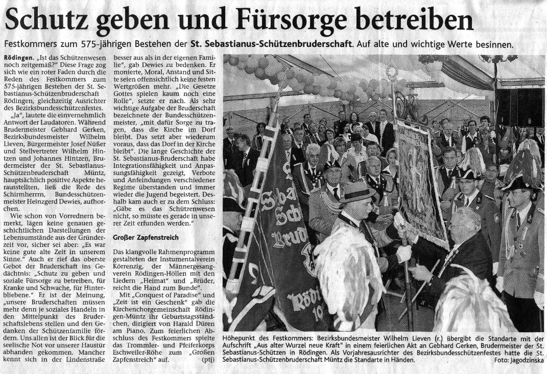 575 Jahre St. Sebastianus-Schützenbruderschaft in Rödingen. Diese Zahl gewinnt an Bedeutung, wenn man überlegt, wie viele Generationen darin enthalten sind. Viele von uns kennen gerade mal noch die Großeltern oder werden nur noch z.B. durch vorhandenes Bildmaterial an seine Vorfahren erinnert. Das Schützenbrauchtum hat auch im Jülicher Land eine lange Tradition. Der Gründungsgedanke war damals das Beschützen der Mitbürger. Aber auch heute fühlen wir uns diesem verpflichtet, welches sich auch noch in der aktuellen Satzung widerspiegelt. Die nahe Stellung zur Kirche wurde dabei nie aus dem Auge verloren. Trotz zunehmendem Werteverfalles stehen die Schützen auch heute noch zu ihren Idealen, sich für Glaube, Sitte und Heimat ein zu-setzen. Die Schützen fühlen sich aber nicht nur heimatverbunden sondern praktizieren es auch im örtlichen Vereinswesen, bei durchzuführenden Maßnahmen im Ort und der Gestaltung vieler ört-lichen Veranstaltungen im Verlauf eines Jahres. Dabei gilt es besonders auf die genera-tionenübergreifende Beziehung zu achten und die Jugend mit einzubinden, damit die Liebe zur Heimat auch zukünftigen Bewohnern unserer Ortschaften erhalten bleibt. Unser Fest bietet jedem die Gelegenheit die Werte unserer althergebrachten Tradition vielen Gästen näher zu bringen, Bekanntschaften zu schließen oder gemeinsam mit vielen Freunden das Schützenwesen lebendig werden zu lassen. Lassen Sie sich von der Geselligkeit im Kreise der Schützen anstecken und feiern Sie mit uns ein beeindruckendes Bezirksbundesschützenfest. Ich lade Sie alle ganz herzlich dazu ein. Gebhard Gerken vorläufiges Festprogramm Bezirksbundesschützenfest: