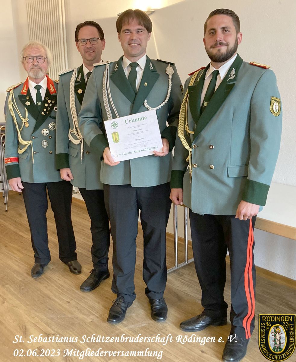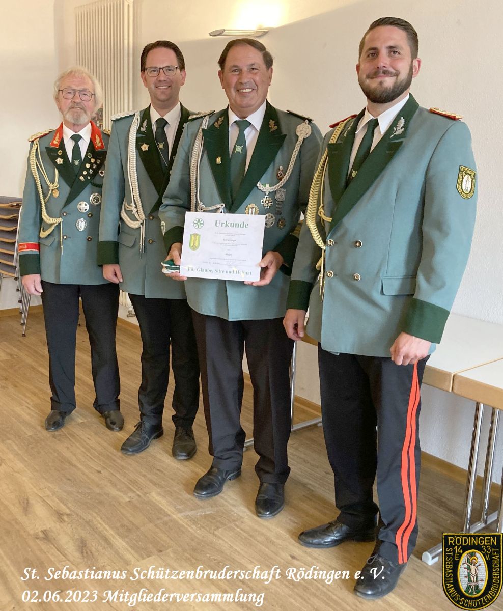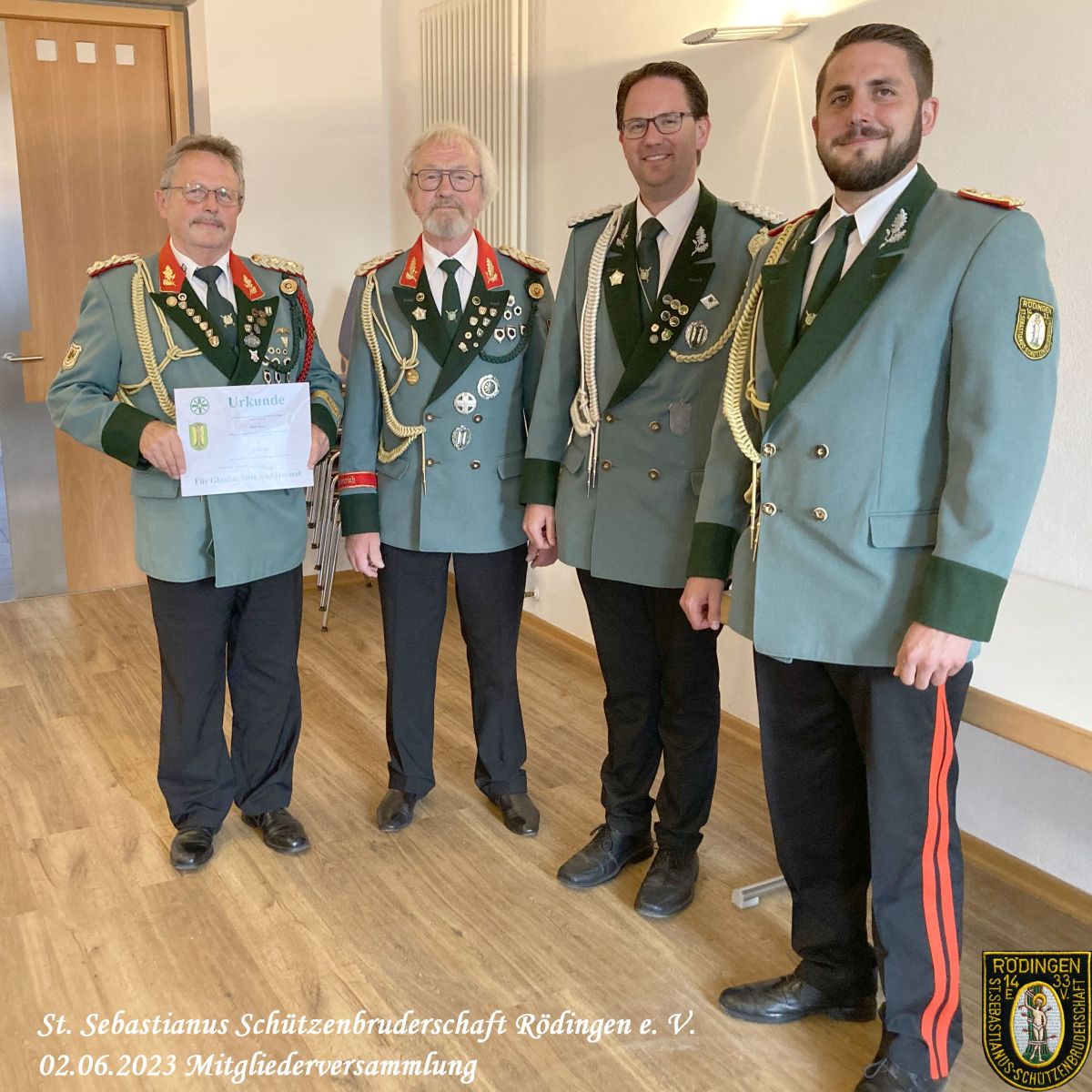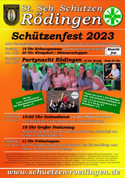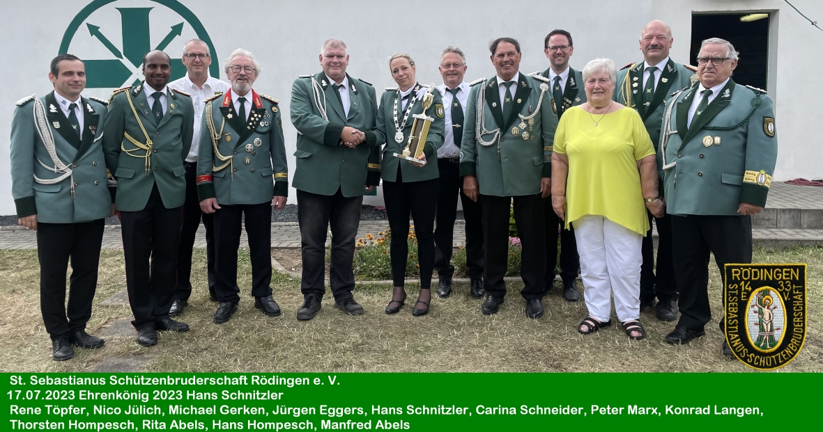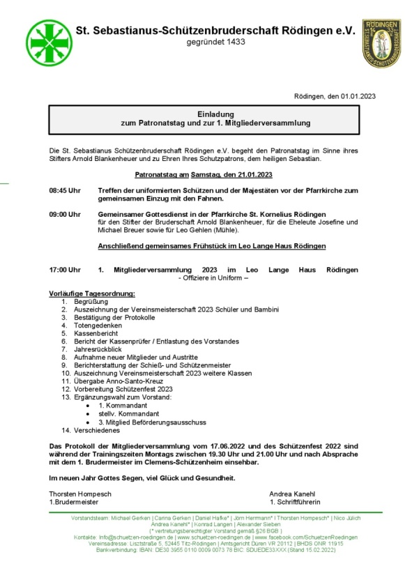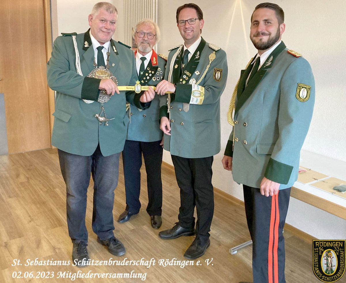 08.09.2023 Familientag an Fronleichnam Neue Majestäten der Schützen in Rödingen Die Schützenbruderschaften in Deutschland basieren meist auf historischen Bürgerwehren, die besonders kirchliche Veranstaltungen schützten. Die unterschiedliche Sicht auf die Wandlung von Brot und Wein, an die Katholiken glauben und die Protestanten während der Reformation als das "schädlichste aller Feste" und Prozessionen als unbiblisch und als Gotteslästerung betrachteten, brachten regelrechte Rangeleien bei den Fronleichnamsprozessionen hervor. Zum Glück ist das schon lange nicht mehr der Fall und heute stehen die Schützen allen Menschen offen gegenüber, die die christlichen Grundsätze akzeptieren. Die diesjährige Fronleichnamsprozession in Rödingen begleiteten die Schützenbruderschaften aus Spiel, Titz, Müntz und Rödingen. Nach dem Schlusssegen wechselte man von der Pfarrkirche in den Pfarrgarten zum Außengelände am Clemens-Schützenheim. Für alle standen Getränke, Grillstand und Cafeteria für das leibliche Wohl bereit und für Kinder gab es Spiel und Spaß beim Lichtgewehrschießen, toben auf der Hüpfburg oder Schminken. Die Ortsvereine traten zum Ortspokal und viele BürgerInnen zum Hans-Weber-Erinnerungsschießen an. Die Siegerehrungen finden beim Schützenfest statt. Der Erlös des Erinnerungsschießens wird von der Schützenbruderschaft später aufgestockt und dem Kindergarten St. Kornelius Rödingen gespendet. Beim Preisvogelschießen konnten Frühstückskörbe, Gutscheine oder auch 2kg schwere Fleischwürste „erschossen“ werden. Der heiße und sonnige Familientag wurde durch ein kurzes Gewitter mit Hagelkörnern fast schon bereichert. Alle standen trocken unter den Zelten und das Prasseln des Hagels auf den Dächern untermalte die gute Stimmung und den Fangesang eines Dorfvereins. Wieder bei bestem Sonnenschein startete der Höhepunkt des Tages das Schießen um die Majestäten-Würden pünktlich. Gestartet wurde mit dem Schülerprinzen bei denen Tim Schneider, Tom Töpfer und Florian Langen antraten. Und mit dem 22. Luftgewehrschuss auf den Gipsvogel wurde Tim Schneider Schülerprinz und bleibt damit ein zweites Jahr Schülerprinz. Vivian Zabel und Niklas Langen traten gegeneinander beim Wettkampf um den Prinzen an. Glücklicher Gewinner wurde Niklas Langen mit dem 36. Schuss auf den Holz-Prinzenvogel. Ein regelrechter sportlicher Wettkampf war das Schießen um die Königswürde, da Eheleute Carina und Jens Schneider sowohl dem sportlichen als auch dem jagdlichen Schießen frönen. Doch mit dem 17. Kleinkaliberschuss fiel der Königsvogel, so dass nach 26 Jahren wieder eine Königin die Bruderschaft anführt. Die Übergabe der Insignien Königskrone, Prinzen- und Schülerprinzen-Pokal fand unter großen Applaus statt. Alle drei Majestäten freuen sich nun auf das Schützenfest vom 14. bis 17. Juli welches wie auch der Familientag im Pfarrgarten als Außengelände des Clemens-Schützenheims gefeiert wird. Bei den Schützenfest-Abendveranstaltungen auf dem wunderschönen Gelände wird die Atmosphäre durch die Lichteffekte sicher wunderbar werden. 09.06.2023 Mitgliederversammlung Die zweite Mitgliederversammlung ist immer etwas Besonderes, da sowohl die amtierenden als auch die zukünftigen Majestäten anwesend sind. König Hans Schnitzler und Prinzessin Laura werden zum Auftakt des Schützenfestes ihre Insignien an die Königin Carina Schneider und den Prinzen Niklas Langen übergeben. Der Schülerprinz Tim Schneider war es 2022 und bleibt es in 2023. Zu Kassenprüfer wurden Thomas Langen, Willi Hintzen, Jürgen Eggers und Hubert Sieben gewählt, so dass Kassierer Jörn Herrmann direkt zu Jahresbeginn 2024 die Kassenbücher prüfen lassen kann. Der Beförderungausschuss hatte aus alle uniformierten Schützen folgende Menschen Beförderungen zugesprochen: Zum Leutnant: Carina Schneider, Jens Schneider, Niklas Langen. Zum Oberleutnant: Thomas Langen. Zum Major: Konrad Langen. Zum General: Gebhard Gerken und Peter Marx Vom Vorstand wurde intensiv die geplante Anschaffung einer vollelektronischen Schießanlage vorgestellt. Damit wird in Rödingen die modernste Anlage im ganzen Jülicher Land aufgebaut. Dies ist nur aufgrund einer Förderung der LEADER-Region „Rheinisches Revier an Inde und Rur“ möglich. Dadurch soll das Sportschießen in Rödingen professionalisiert werden und durch die multimediale Live-Darstellung der Schüsse können Schießender, Zuschauer im Vereinsheim oder sogar über das Internet den Verlauf live oder in der Rückschau betrachten. Der Schießsport wird erlebbarer, weil er aus dem Verborgenen heraus zum Live Erlebnis transformiert. Die wird Zuschauer begeistern, den Schießsport auszuüben und so dessen Zukunft stärken. Mit einer vollelektronischen Schießanlage können die Schießwettbewerbe schneller ausgetragen und ausgewertet werden, so dass auch der Zuspruch beim Cornelius-Pokalschießen steigen oder eine Ausrichtung von Bezirks- oder sogar Teilen der Diözesan-Meisterschaften möglich werden. Rödingen wird damit die kommunale Grenze des Ortes weit überschreiten Vorbereitung