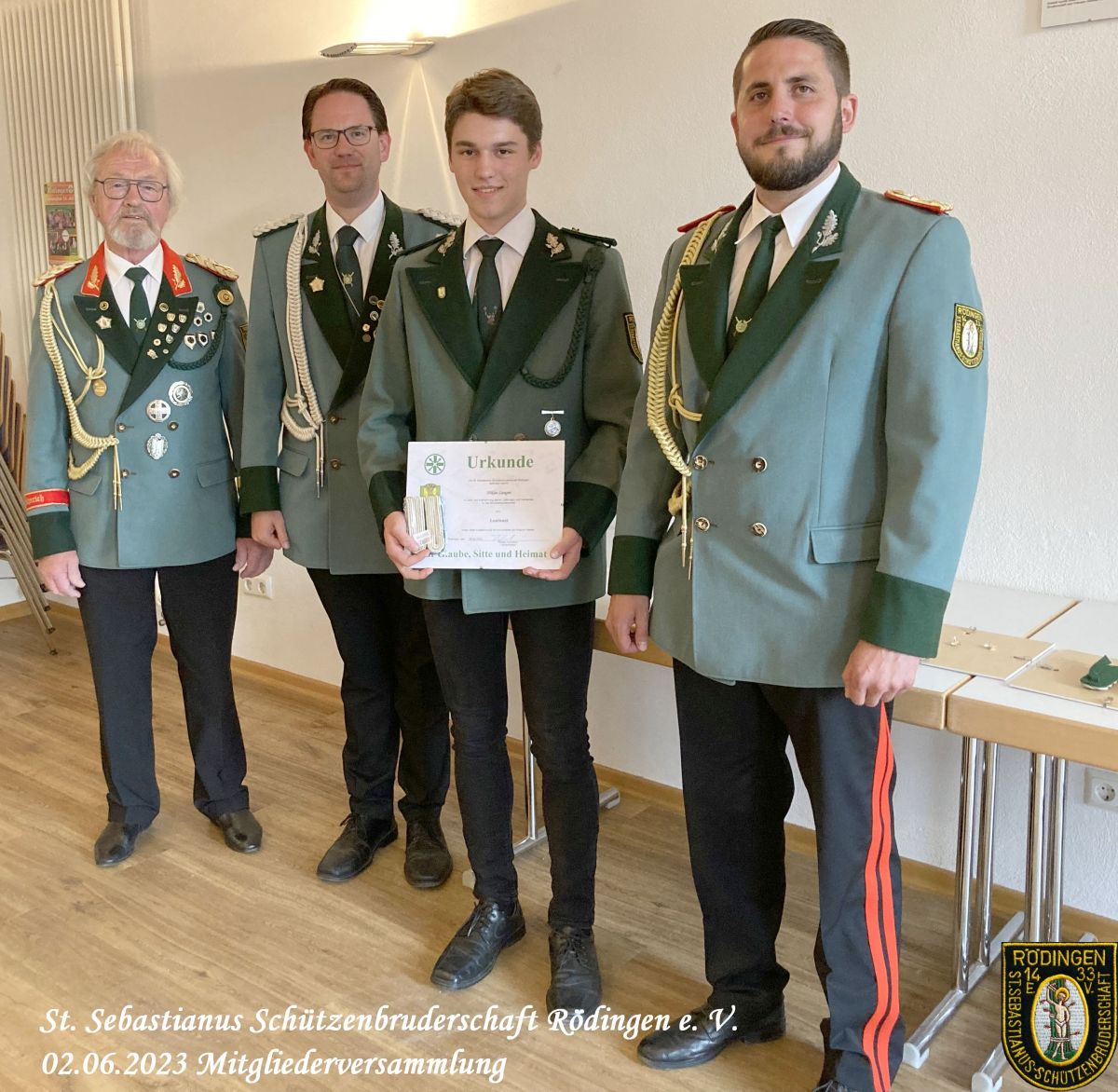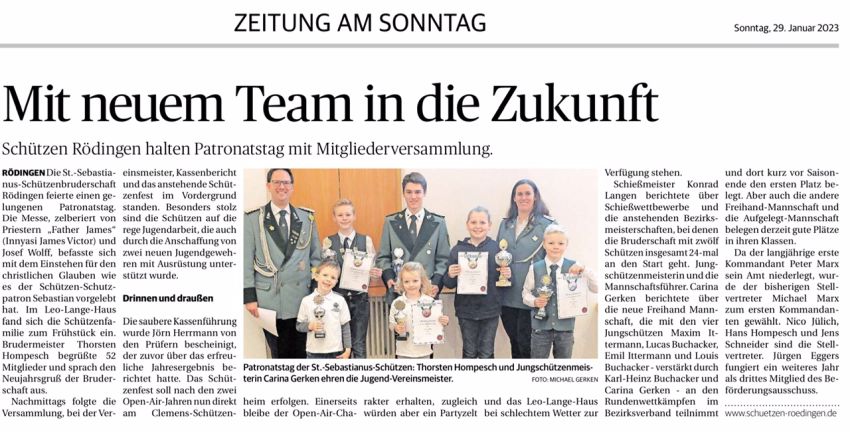 Schießmeister Konrad Langen berichtete über die Schießwettbewerbe, die Anschaffung der beiden Jugend-Luftgewehre und die anstehenden Bezirksmeisterschaften, bei denen die Bruderschaft mit 12 Schützen insgesamt 24 mal an den Start geht, da beim Luftgewehr als auch Kleinkaliber Schießen in verschiedenen Anschlagarten teilgenommen wird. Damit wird Rödingen voraussichtlich die meisten Starts bei den Bezirksmeisterschaften belegen. Anschließend übergab er das Wort an die Jungschützenmeisterin und die Mannschaftsführer. Carina Gerken berichtet mit Stolz über die neue Freihand Mannschaft, die mit den vier Jungschützen Maxim Ittermann, Lucas Buchacker, Emil Ittermann und Louis Buchacker - verstärkt durch Karl-Heinz Buchacker und Carina Gerken - an den Rundenwettkämpfen im Bezirksverband teilnimmt und dort kurz vor Saisonende den ersten Platz belegt. Aber auch die andere Freihand Mannschaft und die Aufgelegt Mannschaft belegen derzeit gute Plätze in ihren Klassen.