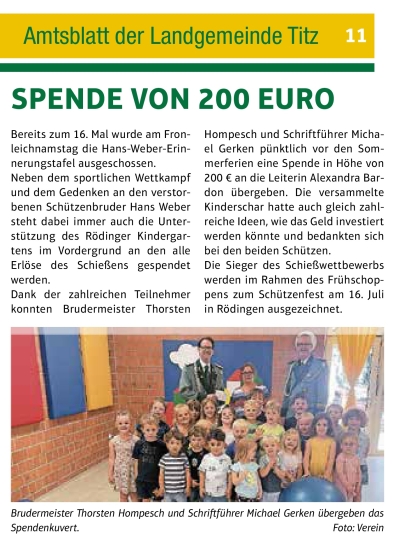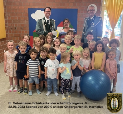 Schützenfest 2023 22.06.2023 Spende von 200 € für den Kindergarten St. Kornelius Bereits zum 16. Mal wurde am Fronleichnamstag die Hans-Weber-Erinnerungstafel ausgeschossen. Neben dem sportlichen Wettkampf und dem Gedenken an den verstorbenen Schützenbruder Hans Weber steht dabei immer auch die Unterstützung des Rödinger Kindergartens im Vordergrund an den alle Erlöse des Schießen gespendet werden. Dank der zahlreichen Teilnehmer konnten Brudermeister Thorsten Hompesch und Schriftführer Michael Gerken pünktlich vor den Sommerferien eine Spende in Höhe von 200 € an die Leiterin Alexandra Bardon übergeben. Die versammelte Kinderschar hatte auch gleich zahlreiche Ideen, wie das Geld investiert werden könnte und bedankten sich bei den beiden Schützen. Die Sieger des Schießwettbewerbs werden im Rahmen des Frühschoppen & Ehrungen Schützenfest Rödingen am 16. Juli ausgezeichnet. 14. - 17. Juli 2023 Schützenfest Vier Tage ausgelassene Stimmung zu Ehren von Königin Carina, Prinz Niklas und Schülerprinz Tim