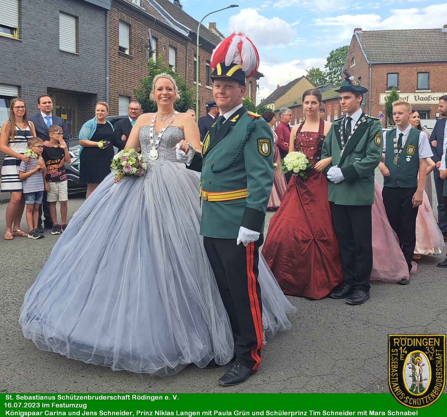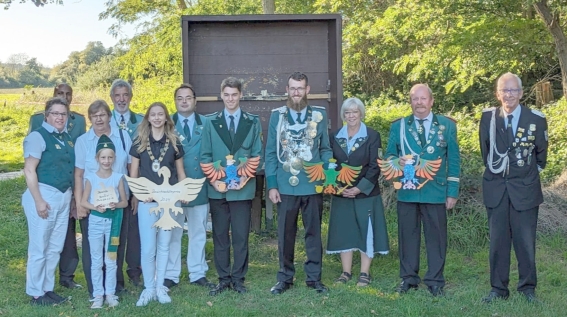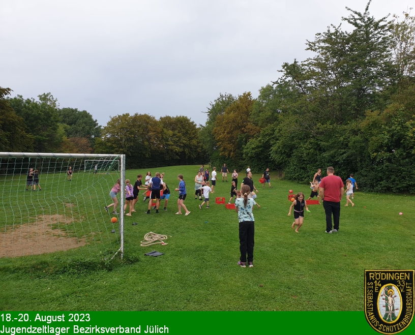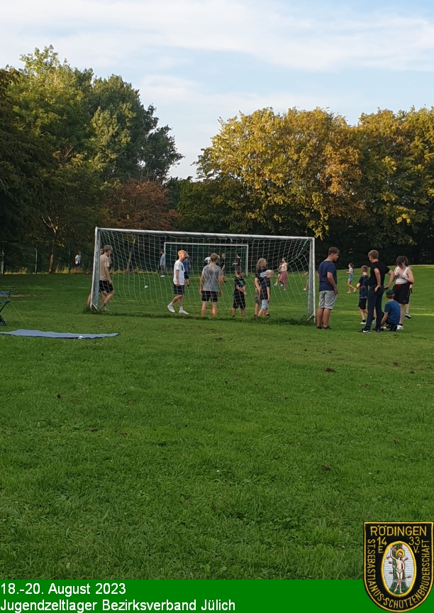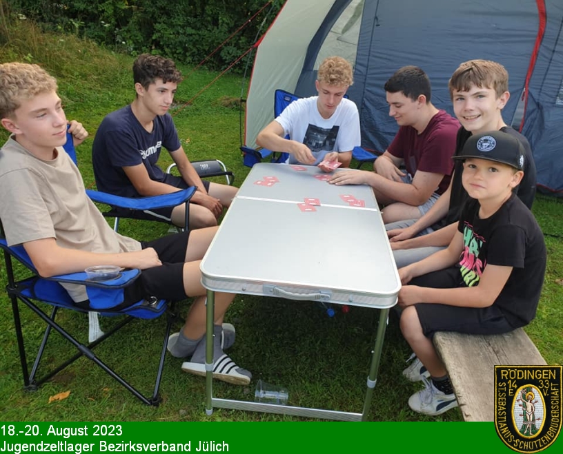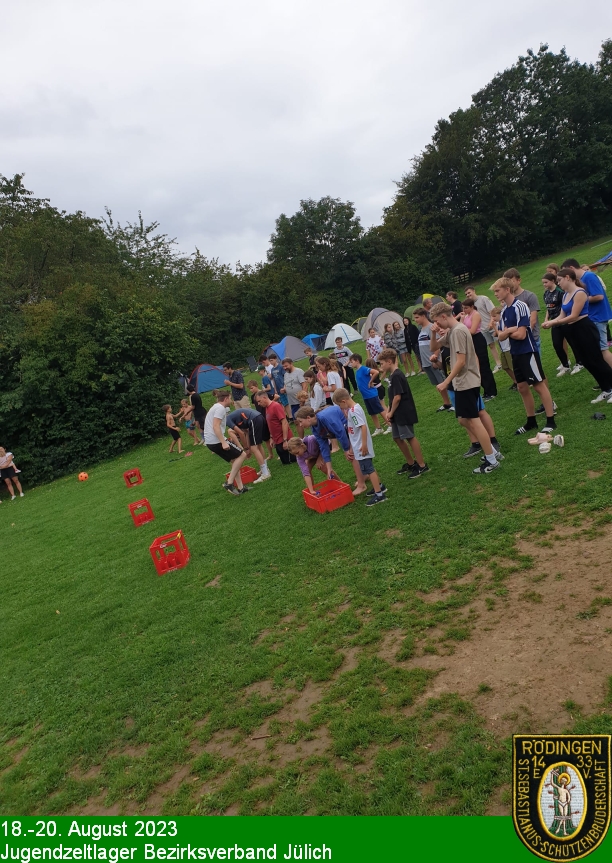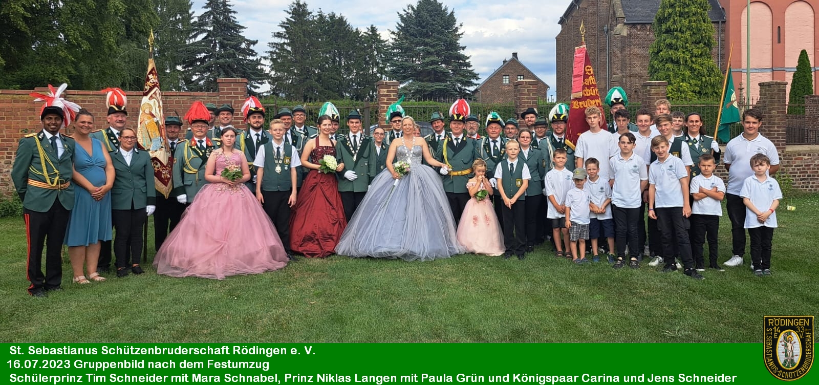 Der Königinnen Sohn Tim war Schülerprinz 2022 und ist es auch in diesem Jahr wieder geworden. Er wechselt nun in die achte Schulklasse und liebt Geschichte, insbesondere die griechische Antike. Neben dem Schwimmen – er absolviert gerade den Kurs zum Rettungsschwimmabzeichen in Bronze – hat er das Schießen zunächst mit dem Lichtgewehr erlernt und übt es nun mit dem Luftgewehr. Pfingsten 2023 gewann er den Günther-Josten-Wanderpokal. Da auch seine jüngeren Geschwister mit dem Lichtgewehr schießen, kann man von einer Schießsport begeisterten Familie sprechen. Prinz Niklas Langen entstammt ebenfalls einer Schützenfamilie. Opa Konrad ist Schießmeister, Schütze der ersten Mannschaft und Jäger und seine Oma Gerda war 1975 die erste Frau in der Schützenbruderschaft. Vater Thomas – auch Schütze der ersten Mannschaft – hat diese Begeisterung weiter gegeben und Niklas ist amtierender Aachener Diözesanmeister Olympisch Match mit dem Kleinkaliber. Auch er liebt Geschichte und geht nach den Ferien in die Q2 und macht in einem Jahr sein Abitur . In seiner Freizeit spielt er Tennis und mit seiner E-Gitarre in einer Schülerband, die sich dem Rock bis Metal Rock verschrieben hat. Alle drei Majestäten freuen sich mit Freunden nun auf das Schützenfest vom 14. bis 17. Juli welches komplett auf dem Außengelände des Clemens-Schützenheims in Rödingen gefeiert wird. Schutz vor Sonne bietet ein Festzelt. Bei den Abendveranstaltungen auf dem wunderschönen Gelände wird die Atmosphäre durch Lichteffekte sicher wunderbar werden. Am Freitag 14. Juli startet das Schützenfest mit der Krönungsmesse um 19 Uhr in der Pfarrkirche Rödingen zu der die neuen Majestäten mit ihrem bunten Gefolge an der Königinnenresidenz abgeholt werden. Anschließend legen die Schützen einen Kranz am Ehrenmal der Kriegsverstorbenen nieder und ziehen mit Marschmusik zum Festgelände, um den Königinnenwalzer beim Dämmerschoppen zu feiern. Am Samstag 15. Juli ab 19 Uhr beginnt die große Sommerparty mit NOVESIA Live, der Coverband die Schützenfeste zwischen Neuss und Bergheim zu einem besonderen Erlebnis macht. Eintrittskarten dazu gibt es im Klön-Café bei Carlo‘s-Eck, Hohestraße 1, Rödingen. Der Sonntag 16. Juli startet um 10 Uhr mit einem Gottesdienst in der Pfarrkirche, bevor beim Frühschoppen die Jubilare und Sieger des Ortswanderpokalschießen und der Hans-Weber Erinnerungstafel geehrt werden. Um 18 Uhr zieht der große Festumzug mit allen Ortsvereinen, befreundeten Schützenbruderschaften und vier Musikkapellen durch Rödingen und Höllen(Zugweg auf der Homepage). Höhepunkt des Festzuges ist die große Parade zu Ehren der Majestäten am Markt. Am Montag 17. Juli ab 11 Uhr lassen die Schützen das Festwochenende mit dem Frühschoppen, bei dem auch die Verlosung, ein Preisschießen und das Ausschießen der Ehrenpokale für ehemalige Könige und Prinzen erfolgt, ausklingen. 18.08.2023 Jugend-Zeltlager Bezirksverband Jülich Am Wochenende von Freitagnachmittag bis Sonntagmittag fand das Zeltlager des Bezirksverbandes Jülich in Finkenheide statt. Insgesamt nahmen über 60 Kinder und Jugendliche aus dem Bezirksverband Jülich teil. Nach dem Aufbauen der Zelte fand am Freitagabend ein Wortgottetdienst mit dem Diakon Tim Wüllenweber statt. Bei dem anschließenden Lagerfeuer wurden erste Kontakte zu den anderen Jugendlichen geknüpft. Der Samstag startete mit einem informativen Austausch des Imkers Mark Schutzbereich. Es konnten alle Fragen der Kinder zum Thema Bienen beantwortet werden. Im Anschluss würden kleine Bienenhotels gebaut. Das gute Wetter verführt zu einer spontanen Wasserrutsch-Aktion. Nach dem Mittagessen kämpften die drei Teilnehmergruppen in verschiedenen Spielen um den Sieg. Im Stechen beim Tauziehen wurde später ein Sieger ermittelt. Abgerundet wurde der Samstag mit einer Nachtwanderung und dem späteren Verzehr von Stockbrot und Marshmallow. Allen Teilnehmern hat das Wochenende gut gefallen. Eine erneute Teilnahme Zeltlager im nächsten Jahr wird fest eingeplant. 20.08.2023 Ausflug der Schützen nach ins Sauerland nach Am frühen Sonntag machten sich 37 Schützen mit dem Königspaar Carina und Jens und dem Schülerprinz Tim auf den Weg zum Schützenfest der Schützenbruderschaft St. Sebastian Brockhausen 1888. Mit etwas Verspätung kamen wir an der Kapelle in Werringsen an, wo Ortsvorsteher Theo Ostermann in einem kurzweiligen Vortrag auf die Geschichte des Bauwerks einging. Leider werden dort aktuell keine Gottesdienste gefeiert. Umso schöner und emotional war es, als Präses Nico Jülich zum Abschluss des Vortrags ein Gebet sprach und die anwesenden segnete. So kam mal wieder ein Hauch von Gottesdienst in die alten Mauern. Nach einer kurzen Stärkung ging es mit dem Spielmannszug in Treue Fest Schwitten und einigen Offizieren der Gastgeber zum Antreten und Abholen des Königinnenpaars. Im Anschluss startete der große Festzug mit Parade bei bestem Wetter und mit vielen Schaulustigen an den Straßenrändern und endete am Festplatz. Dort warteten wir bei bester Verpflegung auf den nächsten Höhepunkt, das Kaiserschießen. Um 18 Uhr begann der spannende Wettkampf bei dem sich Ehrenoberst Michael Goeke mit dem 119. Schuss die Kaiserwürde sicherte. Nach kurzer Gratulation mussten wir uns leider recht schnell auf die etwa zwei stündige Heimfahrt machen. Wir danken den neuen Freunden aus Brockhausen sehr für den besonders herzlichen Empfang und die Gastfreundschaft. Wir hatten einen wirklich tollen Tag. September Bundesmeisterschaft 2023 Ein besonderer sportlicher Höhepunkt ist es für alle SchützInnen sich auf den Bundesmeisterschaften zu vergleichen. Die besten Schützen aus den Diözesanverbänden Aachen, Essen, Köln, Münster, Paderborn und Trier vergleichen sich dort. Umso beachtenswerter sind die Ergebnisse unserer Schützen und dabei insbesondere Niklas Langen, der in seinem erstenm Jahr mit dem Kleinkaliber direkt den 3. Platz bei den 60 Schuss liegend in der Diszi