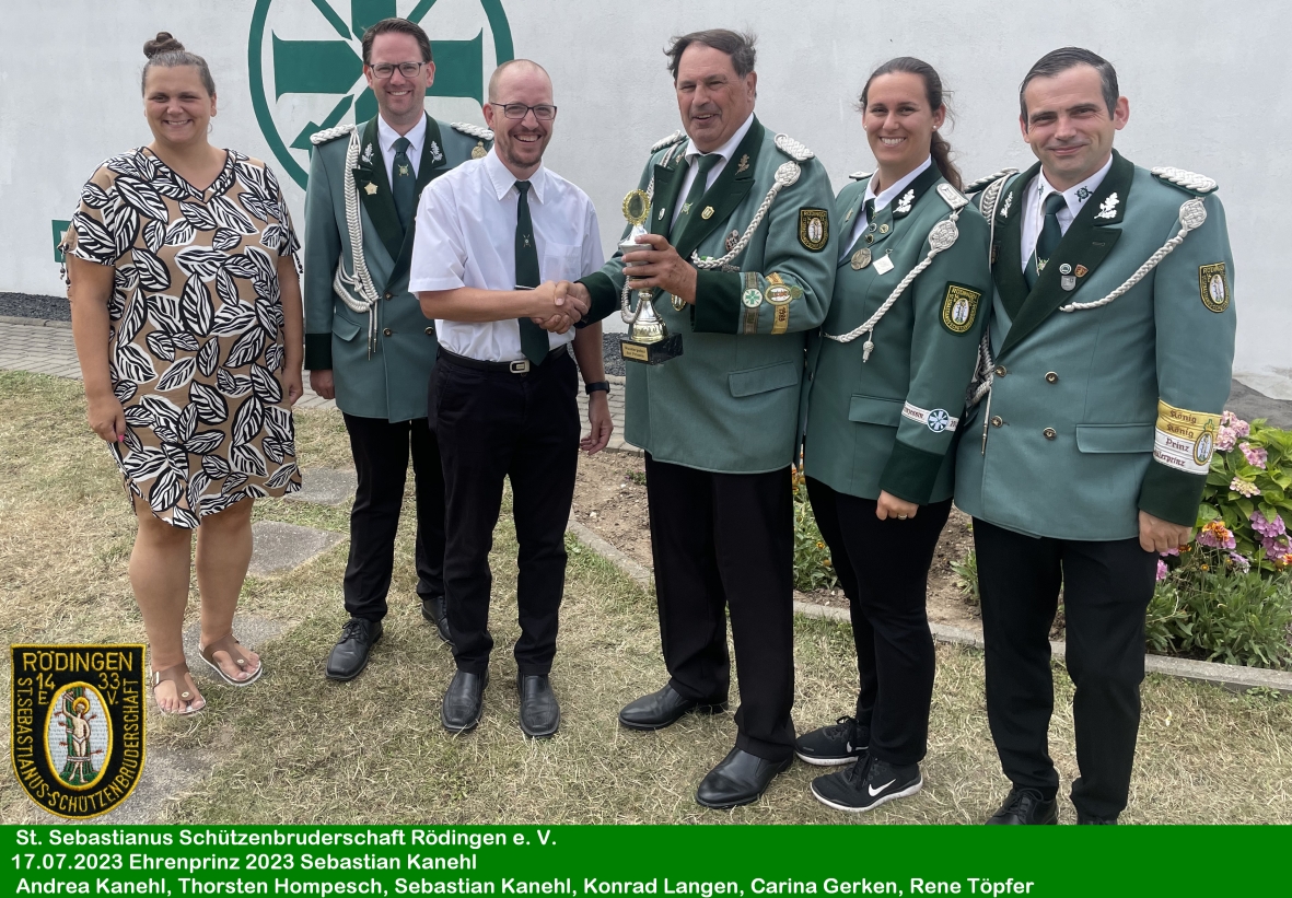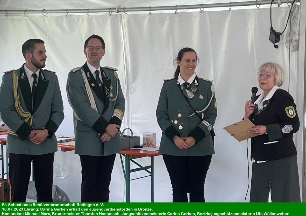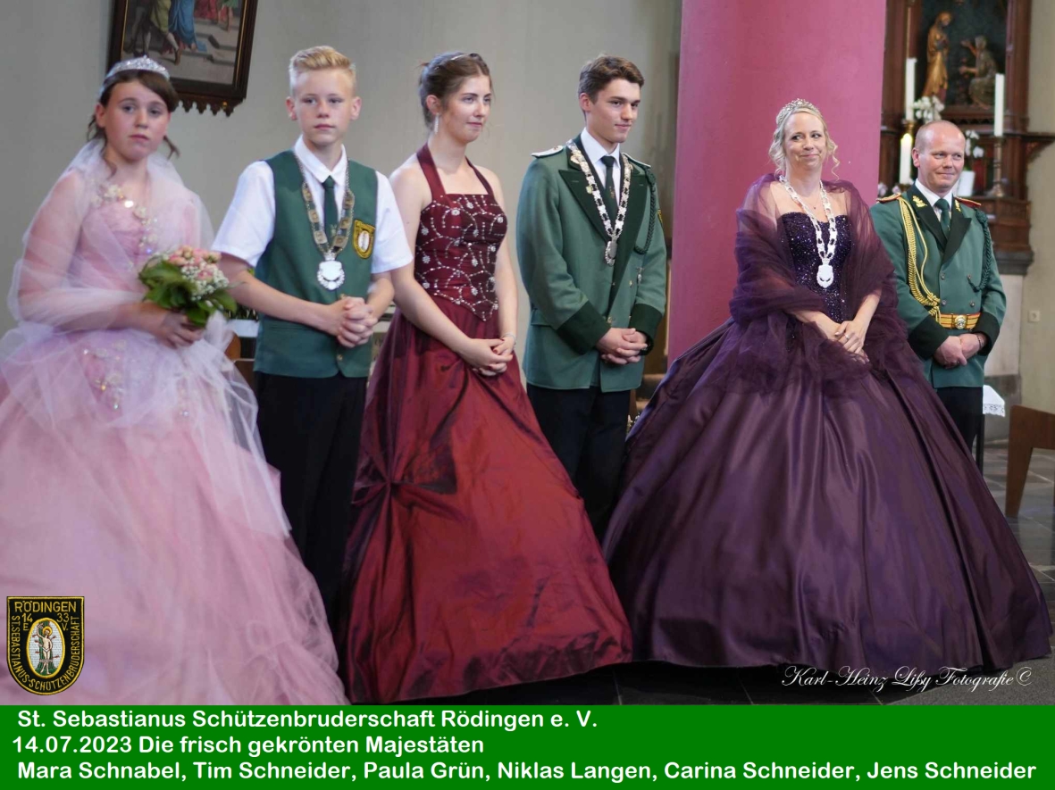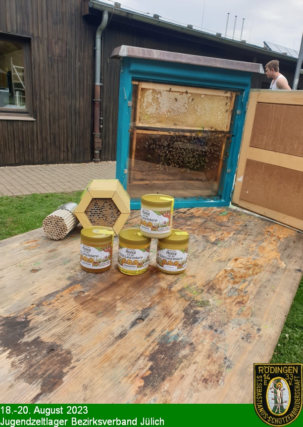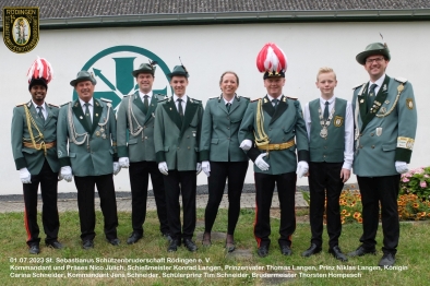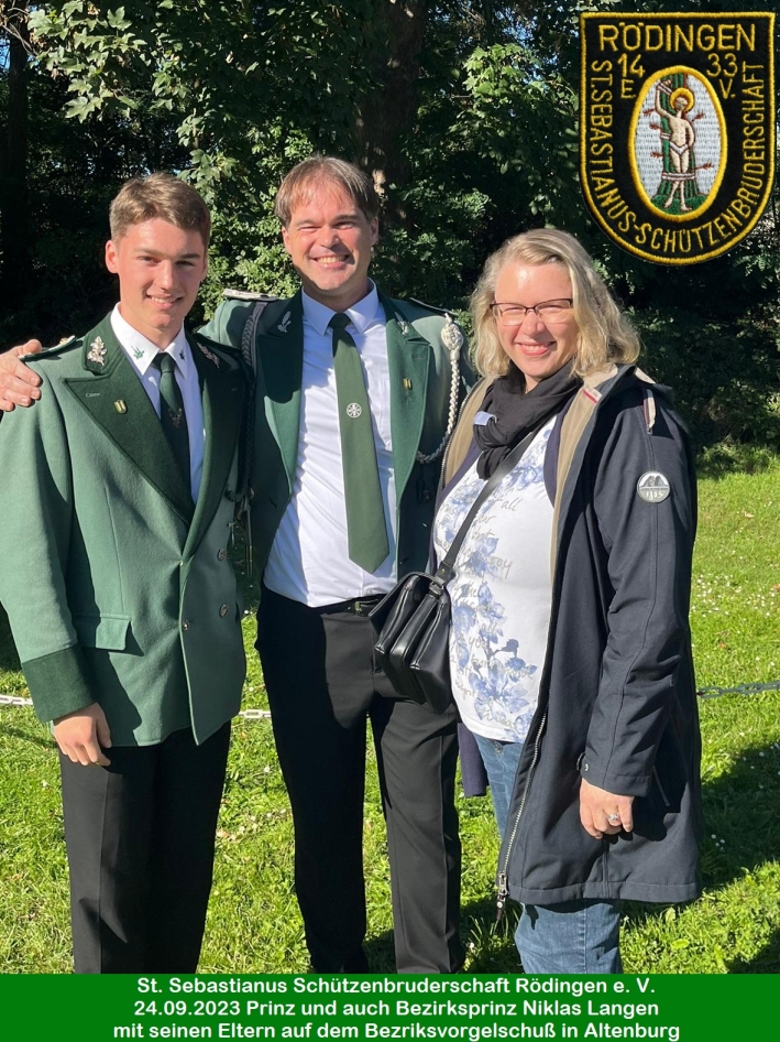 Der Königinnen Sohn Tim war Schülerprinz 2022 und ist es auch in diesem Jahr wieder geworden. Er wechselt nun in die achte Schulklasse und liebt Geschichte, insbesondere die griechische Antike. Neben dem Schwimmen – er absolviert gerade den Kurs zum Rettungsschwimmabzeichen in Bronze – hat er das Schießen zunächst mit dem Lichtgewehr erlernt und übt es nun mit dem Luftgewehr. Pfingsten 2023 gewann er den Günther-Josten-Wanderpokal. Da auch seine jüngeren Geschwister mit dem Lichtgewehr schießen, kann man von einer Schießsport begeisterten Familie sprechen. Prinz Niklas Langen entstammt ebenfalls einer Schützenfamilie. Opa Konrad ist Schießmeister, Schütze der ersten Mannschaft und Jäger und seine Oma Gerda war 1975 die erste Frau in der Schützenbruderschaft. Vater Thomas – auch Schütze der ersten Mannschaft – hat diese Begeisterung weiter gegeben und Niklas ist amtierender Aachener Diözesanmeister Olympisch Match mit dem Kleinkaliber. Auch er liebt Geschichte und geht nach den Ferien in die Q2 und macht in einem Jahr sein Abitur . In seiner Freizeit spielt er Tennis und mit seiner E-Gitarre in einer Schülerband, die sich dem Rock bis Metal Rock verschrieben hat. Alle drei Majestäten freuen sich mit Freunden nun auf das Schützenfest vom 14. bis 17. Juli welches komplett auf dem Außengelände des Clemens-Schützenheims in Rödingen gefeiert wird. Schutz vor Sonne bietet ein Festzelt. Bei den Abendveranstaltungen auf dem wunderschönen Gelände wird die Atmosphäre durch Lichteffekte sicher wunderbar werden. Am Freitag 14. Juli startet das Schützenfest mit der Krönungsmesse um 19 Uhr in der Pfarrkirche Rödingen zu der die neuen Majestäten mit ihrem bunten Gefolge an der Königinnenresidenz abgeholt werden. Anschließend legen die Schützen einen Kranz am Ehrenmal der Kriegsverstorbenen nieder und ziehen mit Marschmusik zum Festgelände, um den Königinnenwalzer beim Dämmerschoppen zu feiern. Am Samstag 15. Juli ab 19 Uhr beginnt die große Sommerparty mit NOVESIA Live, der Coverband die Schützenfeste zwischen Neuss und Bergheim zu einem besonderen Erlebnis macht. Eintrittskarten dazu gibt es im Klön-Café bei Carlo‘s-Eck, Hohestraße 1, Rödingen. Der Sonntag 16. Juli startet um 10 Uhr mit einem Gottesdienst in der Pfarrkirche, bevor beim Frühschoppen die Jubilare und Sieger des Ortswanderpokalschießen und der Hans-Weber Erinnerungstafel geehrt werden. Um 18 Uhr zieht der große Festumzug mit allen Ortsvereinen, befreundeten Schützenbruderschaften und vier Musikkapellen durch Rödingen und Höllen(Zugweg auf der Homepage). Höhepunkt des Festzuges ist die große Parade zu Ehren der Majestäten am Markt. Am Montag 17. Juli ab 11 Uhr lassen die Schützen das Festwochenende mit dem Frühschoppen, bei dem auch die Verlosung, ein Preisschießen und das Ausschießen der Ehrenpokale für ehemalige Könige und Prinzen erfolgt, ausklingen. 18.08.2023 Jugend-Zeltlager Bezirksverband Jülich Am Wochenende von Freitagnachmittag bis Sonntagmittag fand das Zeltlager des Bezirksverbandes Jülich in Finkenheide statt. Insgesamt nahmen über 60 Kinder und Jugendliche aus dem Bezirksverband Jülich teil. Nach dem Aufbauen der Zelte fand am Freitagabend ein Wortgottetdienst mit dem Diakon Tim Wüllenweber statt. Bei dem anschließenden Lagerfeuer wurden erste Kontakte zu den anderen Jugendlichen geknüpft. Der Samstag startete mit einem informativen Austausch des Imkers Mark Schutzbereich. Es konnten alle Fragen der Kinder zum Thema Bienen beantwortet werden. Im Anschluss würden kleine Bienenhotels gebaut. Das gute Wetter verführt zu einer spontanen Wasserrutsch-Aktion. Nach dem Mittagessen kämpften die drei Teilnehmergruppen in verschiedenen Spielen um den Sieg. Im Stechen beim Tauziehen wurde später ein Sieger ermittelt. Abgerundet wurde der Samstag mit einer Nachtwanderung und dem späteren Verzehr von Stockbrot und Marshmallow. Allen Teilnehmern hat das Wochenende gut gefallen. Eine erneute Teilnahme Zeltlager im nächsten Jahr wird fest eingeplant. 20.08.2023 Ausflug der Schützen nach ins Sauerland nach Am frühen Sonntag machten sich 37 Schützen mit dem Königspaar Carina und Jens und dem Schülerprinz Tim auf den Weg zum Schützenfest der Schützenbruderschaft St. Sebastian Brockhausen 1888. Mit etwas Verspätung kamen wir an der Kapelle in Werringsen an, wo Ortsvorsteher Theo Ostermann in einem kurzweiligen Vortrag auf die Geschichte des Bauwerks einging. Leider werden dort aktuell keine Gottesdienste gefeiert. Umso schöner und emotional war es, als Präses Nico Jülich zum Abschluss des Vortrags ein Gebet sprach und die anwesenden segnete. So kam mal wieder ein Hauch von Gottesdienst in die alten Mauern. Nach einer kurzen Stärkung ging es mit dem Spielmannszug in Treue Fest Schwitten und einigen Offizieren der Gastgeber zum Antreten und Abholen des Königinnenpaars. Im Anschluss startete der große Festzug mit Parade bei bestem Wetter und mit vielen Schaulustigen an den Straßenrändern und endete am Festplatz. Dort warteten wir bei bester Verpflegung auf den nächsten Höhepunkt, das Kaiserschießen. Um 18 Uhr begann der spannende Wettkampf bei dem sich Ehrenoberst Michael Goeke mit dem 119. Schuss die Kaiserwürde sicherte. Nach kurzer Gratulation mussten wir uns leider recht schnell auf die etwa zwei stündige Heimfahrt machen. Wir danken den neuen Freunden aus Brockhausen sehr für den besonders herzlichen Empfang und die Gastfreundschaft. Wir hatten einen wirklich tollen Tag. September Bundesmeisterschaft 2023 Ein besonderer sportlicher Höhepunkt ist es für alle SchützInnen sich auf den Bundesmeisterschaften zu vergleichen. Die besten Schützen aus den Diözesanverbänden Aachen, Essen, Köln, Münster, Paderborn und Trier vergleichen sich dort. Umso beachtenswerter sind die Ergebnisse unserer Schützen und dabei insbesondere Niklas Langen, der in seinem erstenm Jahr mit dem Kleinkaliber direkt den 3. Platz bei den 60 Schuss liegend in der Diszi