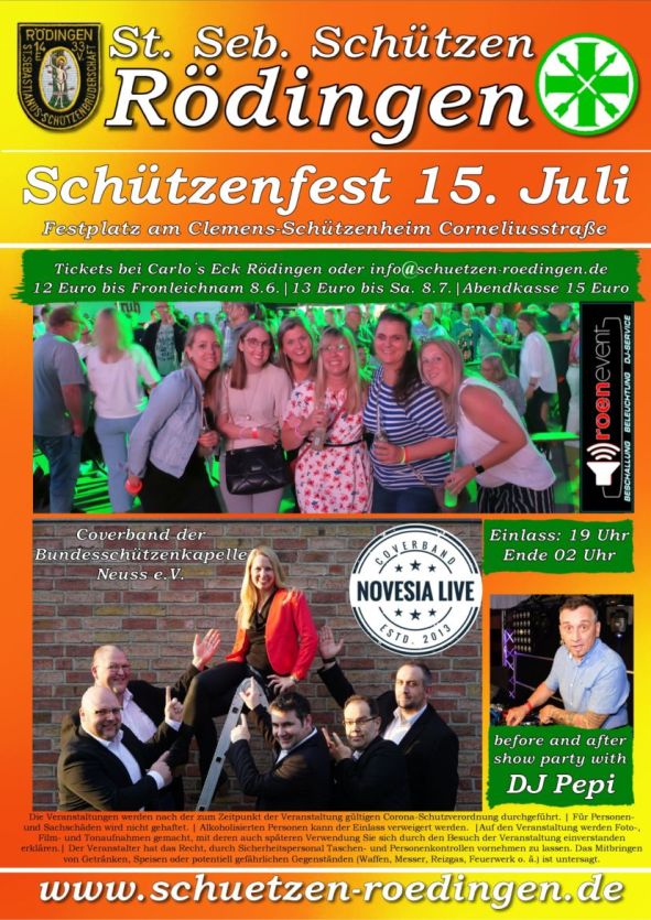 Die Cover- und Partyband "NOVESIA LIVE" sorgt für Stimmung beim sommerlichen Schützenfest in Rödingen. Bei kühlen Getränken und kukki Cocktails wird am Clemens Schützenheim gefeiert. Die Sommerparty findet OpenAir auf dem Rasen oder im Schutz der Partyzelte und des Leo-Lange-Hauses statt. Tanzen pur wird wieder von DJ Pepi aufgelegt. Und von Fritten mit Herz werden wieder köstliche Snacks serviert.