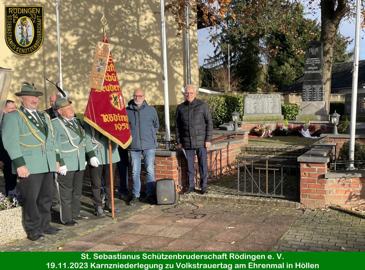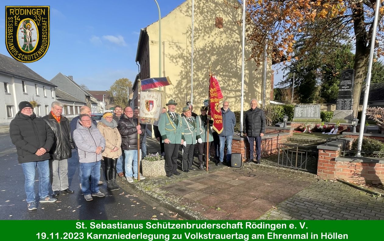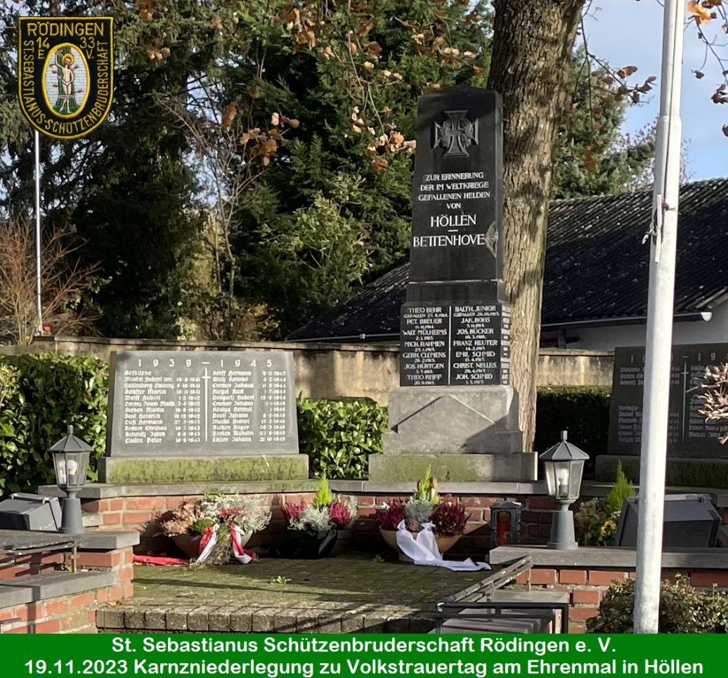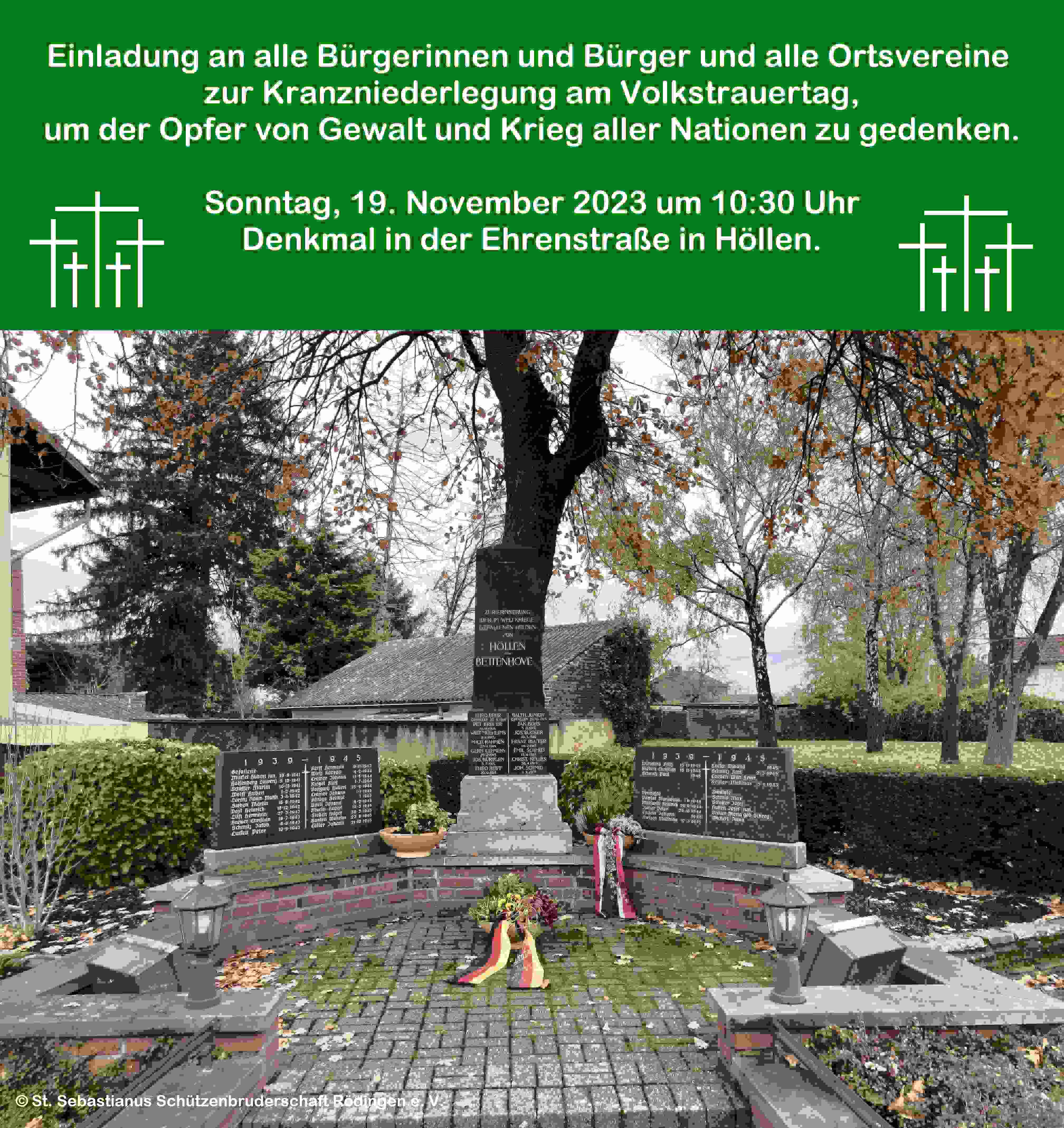 Am Volkstrauertag -Sonntag, 19. Nov. 2023 - erinnerten die Vereine von Rödingen – Höllen und Bettenhoven am Denkmal in Höllen an die Opfer von Gewalt, Krieg, Ausgrenzungen und Terror. Ortsvorsteher Wilhelm Hintzen machten mit seinen Worten deutlich, dass in der Welt, in Deutschland und auch in unseren Orten sich jeder für Frieden und friedliches Miteinander einsetzen muss. Vertreter der Ortsvereine verlasen Texte zum Gedenken an die Opfer, zur Trauer der Angehörigen und Bitten, die gegen Gewalt, Krieg, Ausgrenzungen und Terror gerichtet sind.