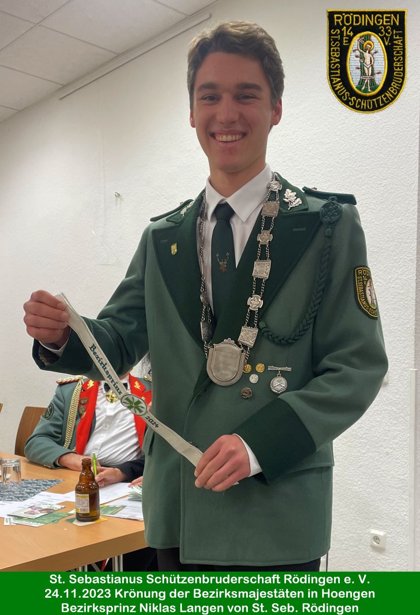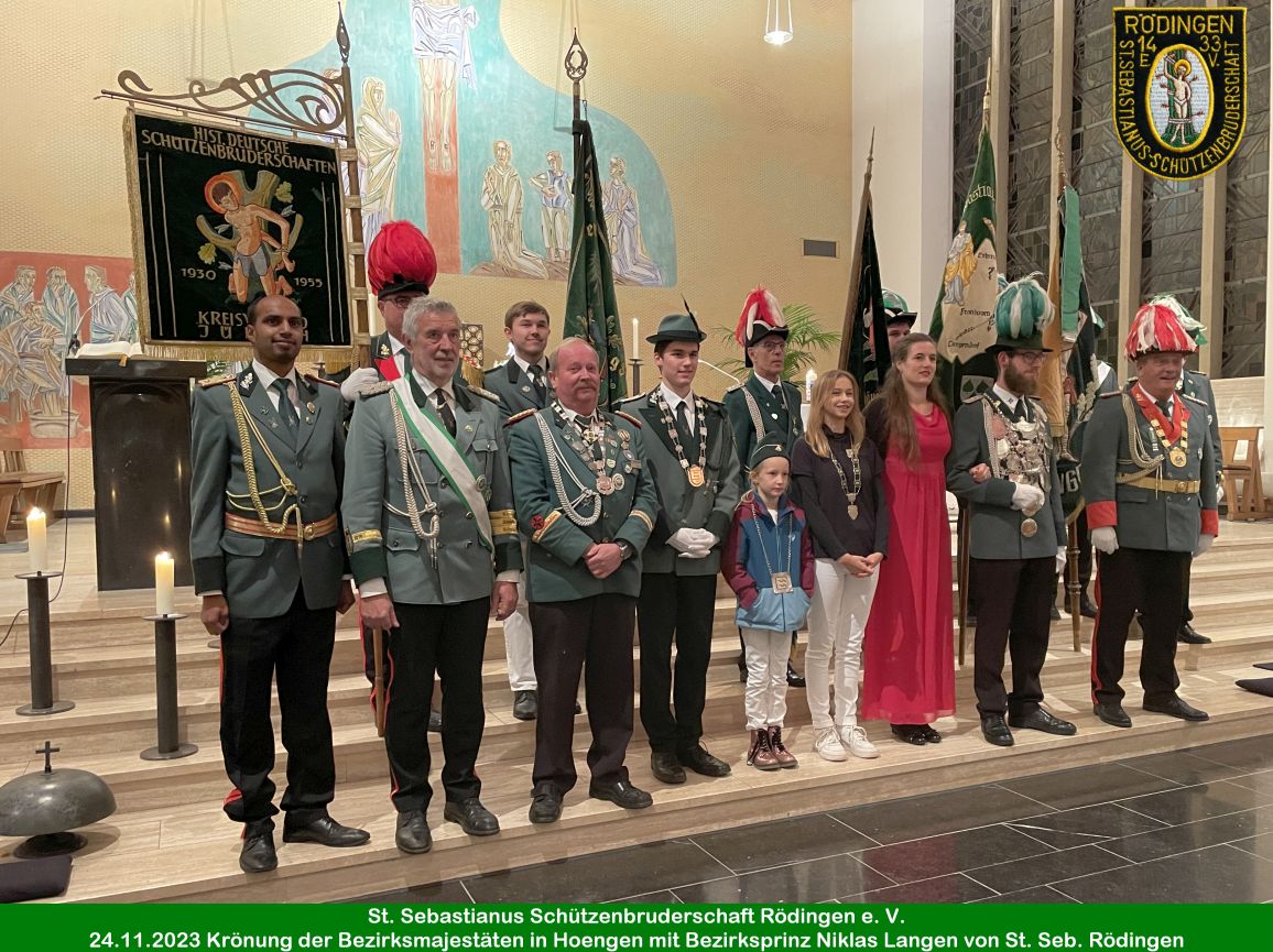 24.11.2023 Krönungsmesse Bezirksmajestäten und Herbstdelegiertentagung In der Krönungsmesse in der Kirche St. Kornelius Hoengen wurden am Freitag 24.11.23 die Bezirksmajestäten in Ihre Ämter erhoben. Mit dabei Bezirks-Prinz Niklas Langen von unserer St. Seb. Schützenbruderschaft Rödingen. Gratulation an alle Majestäten: Bezirks-Bambiniprinzessin Leonie Breuer (Welldorf), Bezirks-Schülerprinzessin Lena Nießen (Broich), Bezirks-Ehrenkönig Reiner Koch (Dürboslar), Bezirks-König Andreas Mertens (Hoengen) Bei der Anschließenden