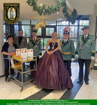 06.12.2023 Adventsgruß der Schützen Rödingen im Altenheim Hasselsweiler Da staunten die Bewohner des Alten- und Pflegezentrum Heilige Familie in Hasselsweiler, als die Königin Carina Schneider in langer Robe begleitet von Ehemann Jens eintrat. Der schwungvolle Einmarsch und das wehende Kleid bei der Schlussdrehung wurden mit Applaus quittiert. In jeder Wohngruppe übergab die Abordnung einen vitaminreichen Obstkorb und wünschte eine besinnliche Adventszeit, ein fröhliches Weihnachtsfest und schon am Nikolaustag alles Gute für das kommende Jahr 2024. Besonders überrascht und erfreut war die Kaiserin der St. Seb. Schützenbruderschaft Rödingen: Gertrud Reuter wohnt seit diesem Jahr in einer netten Wohngruppe. Nach ihrem dritten Königsjahr (1982, 1994, 1997) wurde sie zur Kaiserin und ist schon seit 45 Jahren Schützenschwester. Mit ein paar kurzen Gesprächen in jeder Wohngruppe brachten die Schützen allen Bewohnern ein wenig Abwechslung.