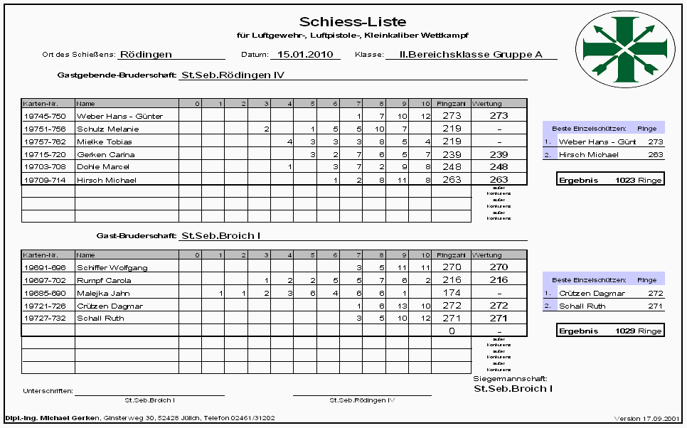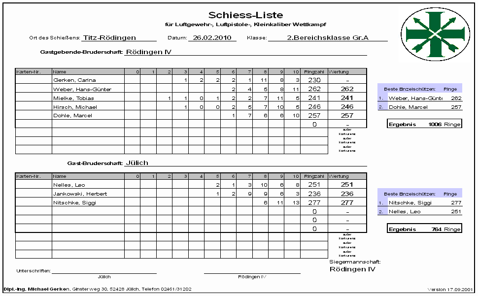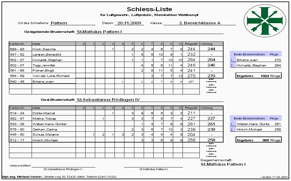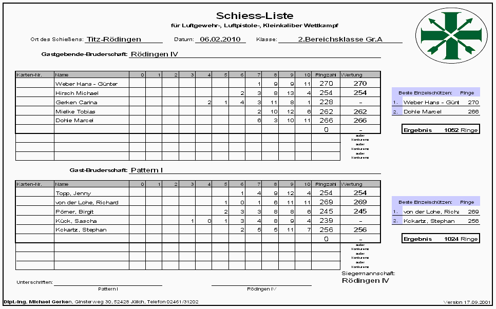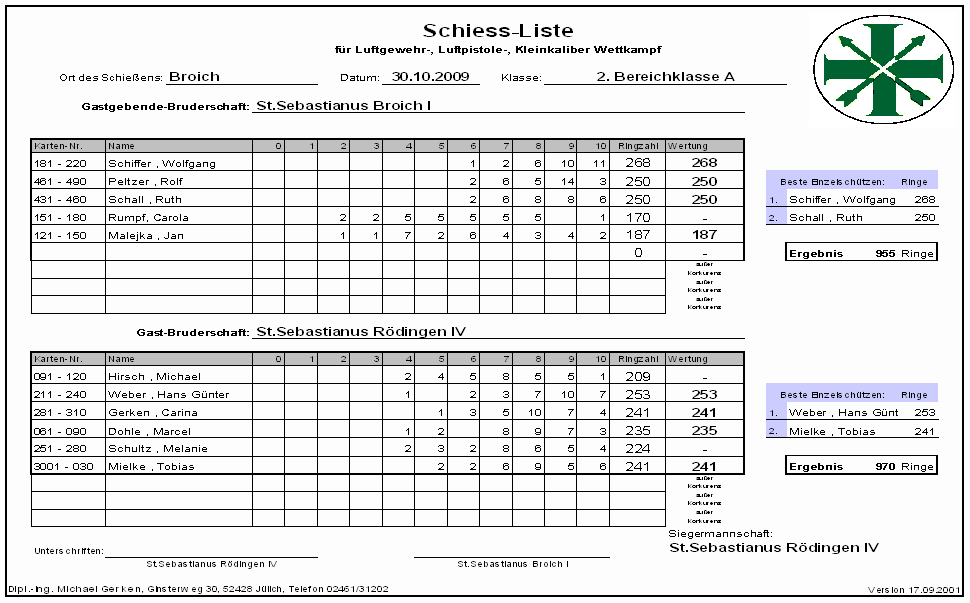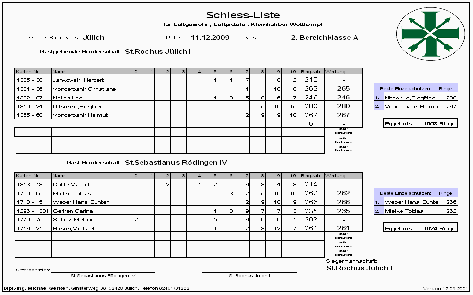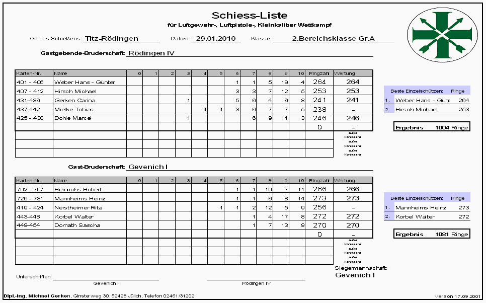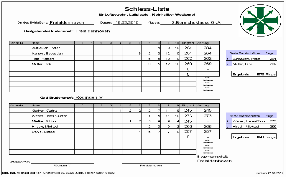 Namen und Adressen der Mannschaftsführer und Schießstände